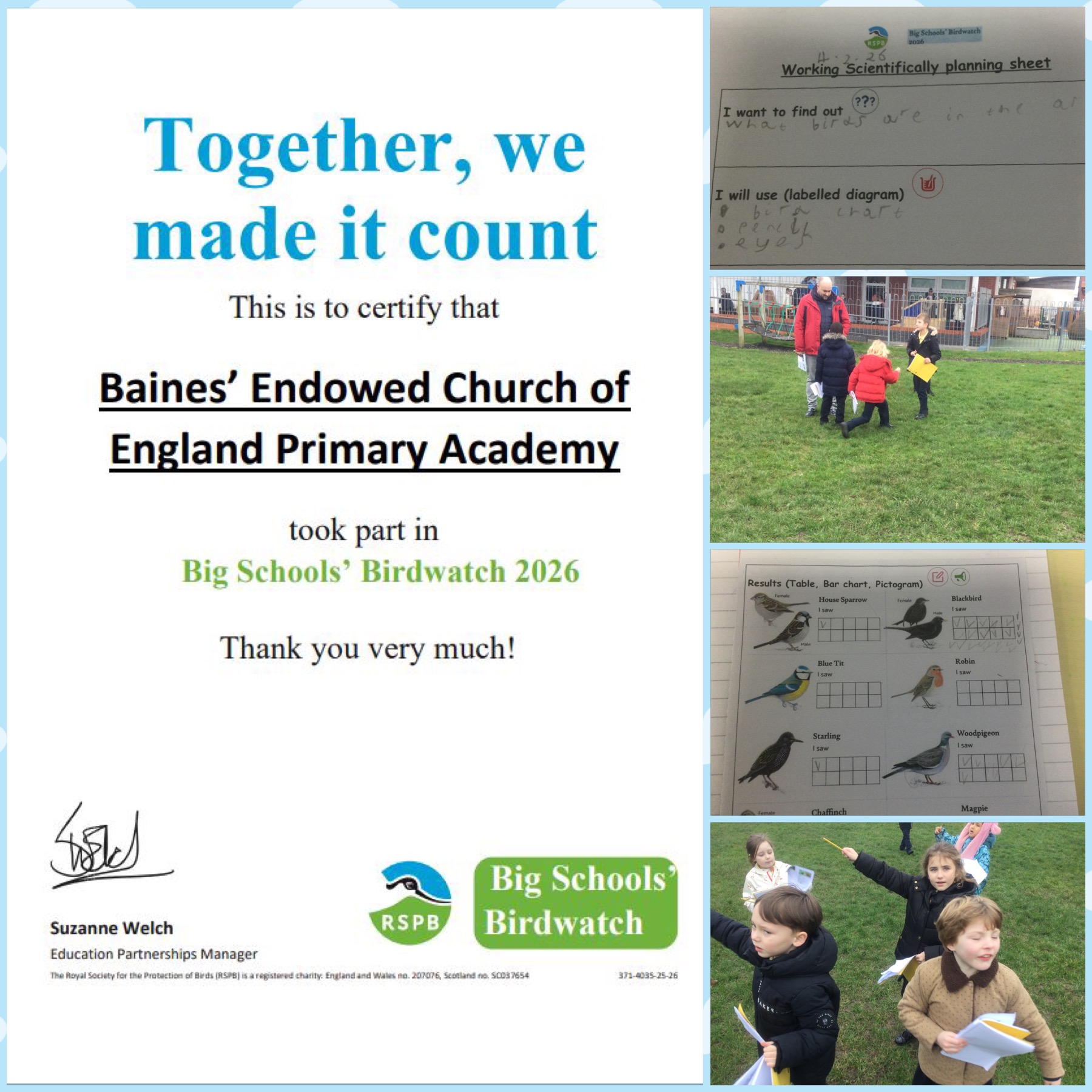 We are delighted to announce that our Year 2 pupils have been officially recognised for their participation in the RSPB Big Schools' Birdwatch.